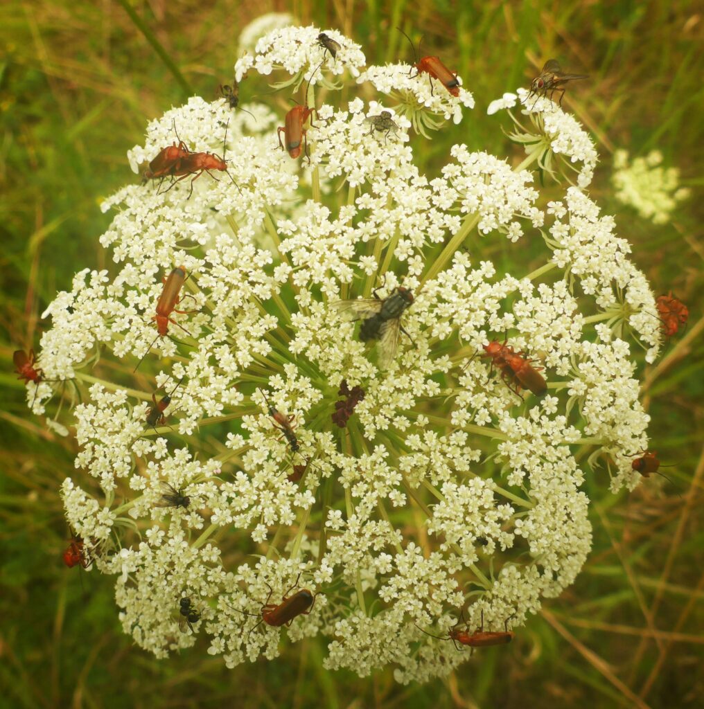 I juli 2025 var det 10 år siden Grøn Agenda Sydhavn havde sin første arbejdsdag i Sommerfugleengen midt på Sydhavnstippen. I den anledning har vi skrevet et jubilæumsskrift med status for artsrigdommen i det lille indhegnede område. Billedet af gulerodsblomsten herunder siger mere end mange ord: der sidder 27 insekter og 13 insektarter.